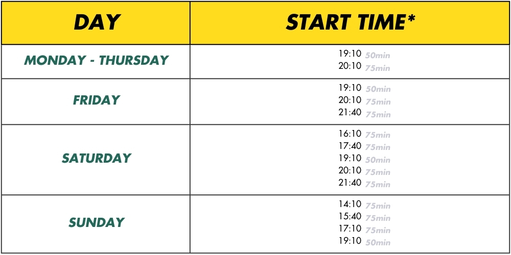 The Black Box Battle is booked per fixed time slot. Check the available start times per day below and book via the yellow button to secure your spot.