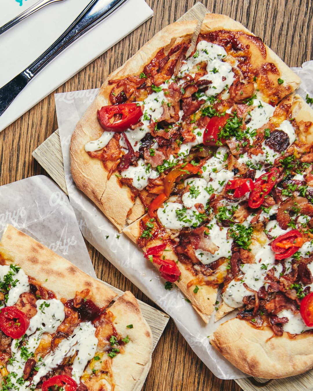 Pinsa with O’Learys’ signature BBQ sauce, pulled chicken, bacon, caramelized onions, jalapeños, shredded mozzarella & cheddar. Topped with ranch dressing and parsley.
