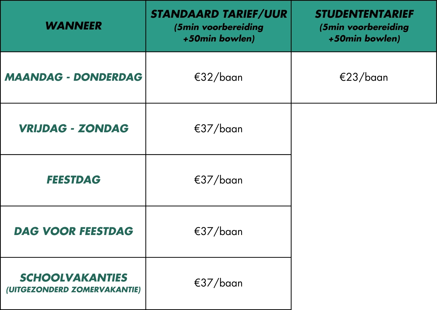 • DUUR: Je huurt de banen per 50 minuten. Je speelt met maximaal 6 personen per baan. Op 50 minuten kan je gemakkelijk met 6 personen één spel uitspelen.