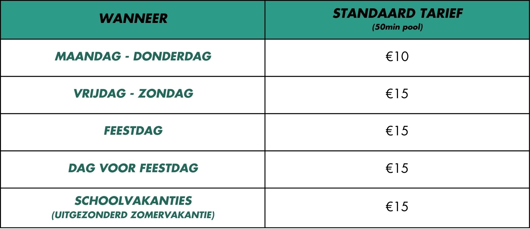 - TIJD: Je huurt de pooltafels per 50 minuten.