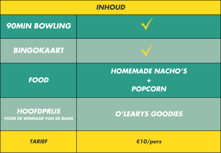 €10 per persoon, inclusief bingokaart, nacho's, popcorn en 90 minuten bowlen. Tickets verkrijgbaar via onze webshop