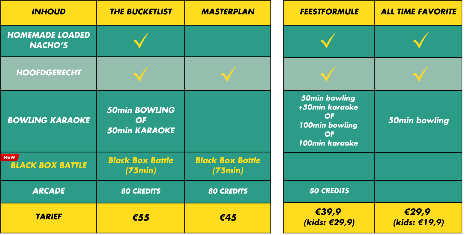 - BOWLEN OP VRIJ/ZA: Een bowlingbaan reserveren is op vrijdag en zaterdagavond tussen 19u & 23u enkel mogelijk in combinatie met één van onze populaire combo-formules.