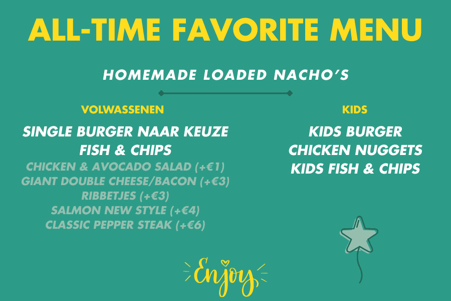 All-time favorite: €29,9/p (kids < 12 jaar €19,9/p)