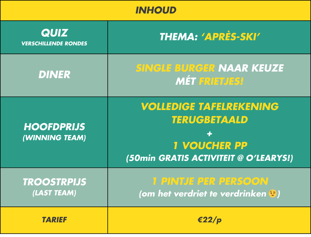 Zet je skibril op, trek je lederhosen aan en bereid je voor op een spetterende quizavond vol winters plezier! ⛷️🎶 Van de grootste après-ski hits tot iconische wintersportmomenten en de lekkerste shotjes– weet jij alles over de ultieme après-ski beleving? Dan is deze quiz jouw kans om te shinen! 🌟
