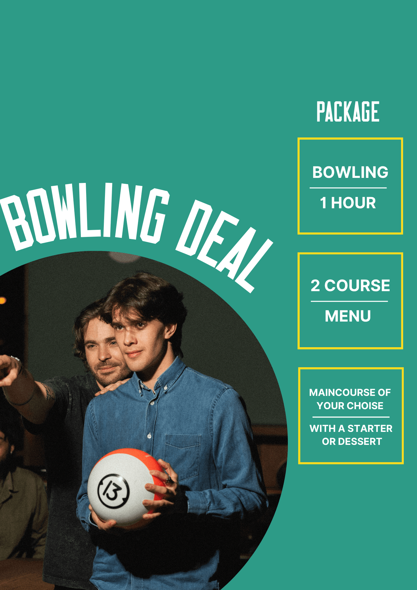 Enjoy a full night @ Olearys Mall Of Netherlands with a 2 course menu and 1 hour of bowling for your group. Can be booked for minimum 4 persons. Kids under 12 years can choose main course from kids menu and pay €12.95 for package