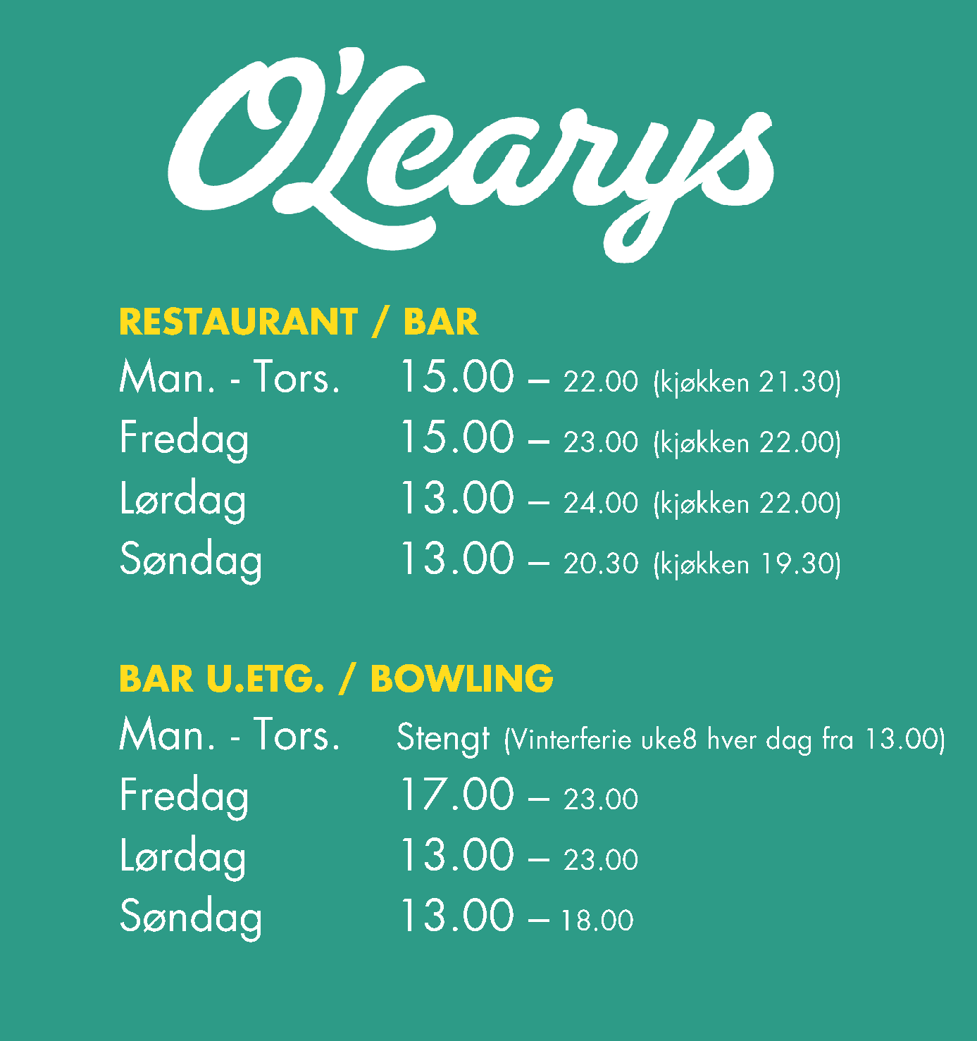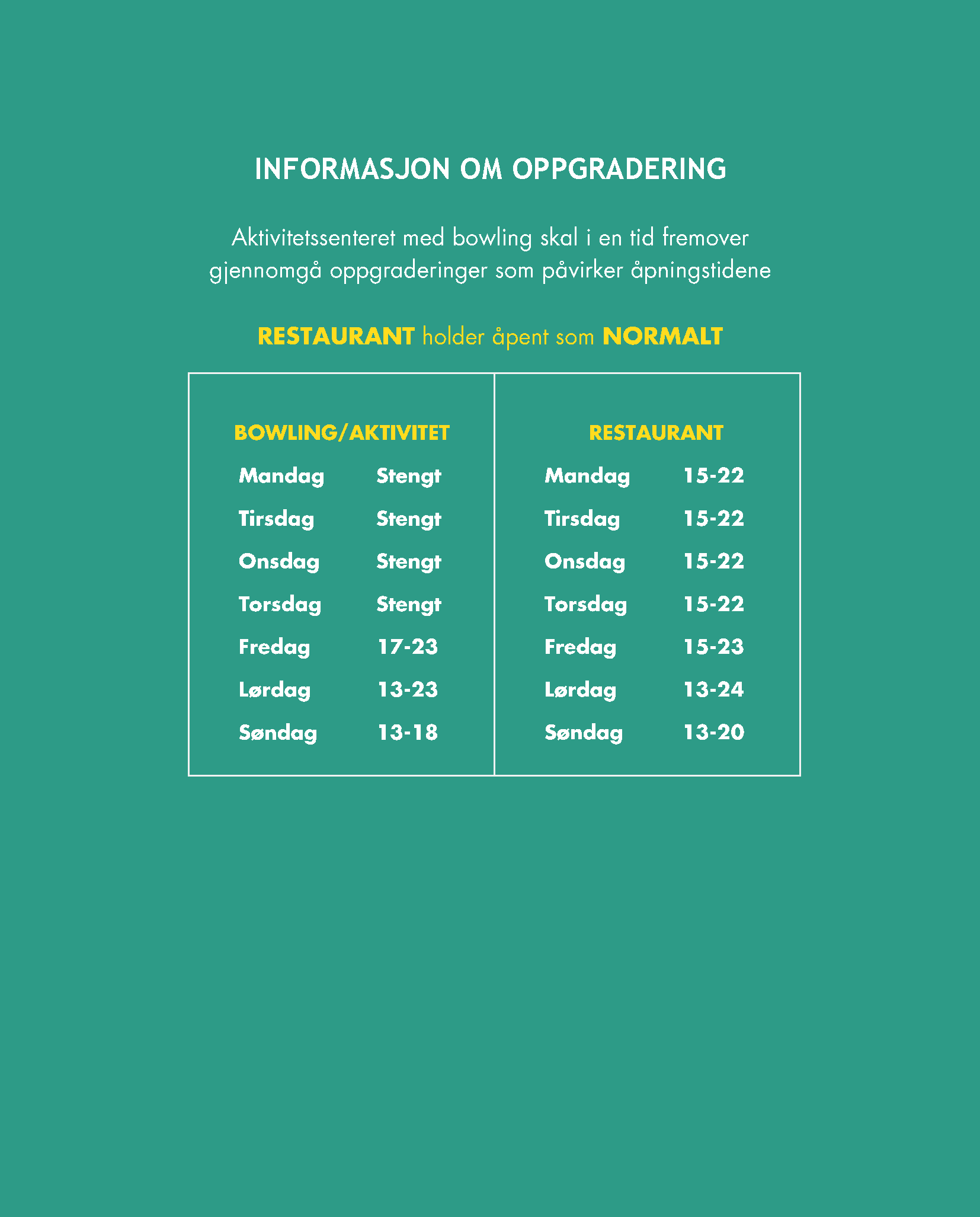 Aktivitetssenteret med bowling skal i en tid fremover gjennomgå oppgraderinger som påvirker åpningstidene. RESTAURANT holder åpent som NORMALT.