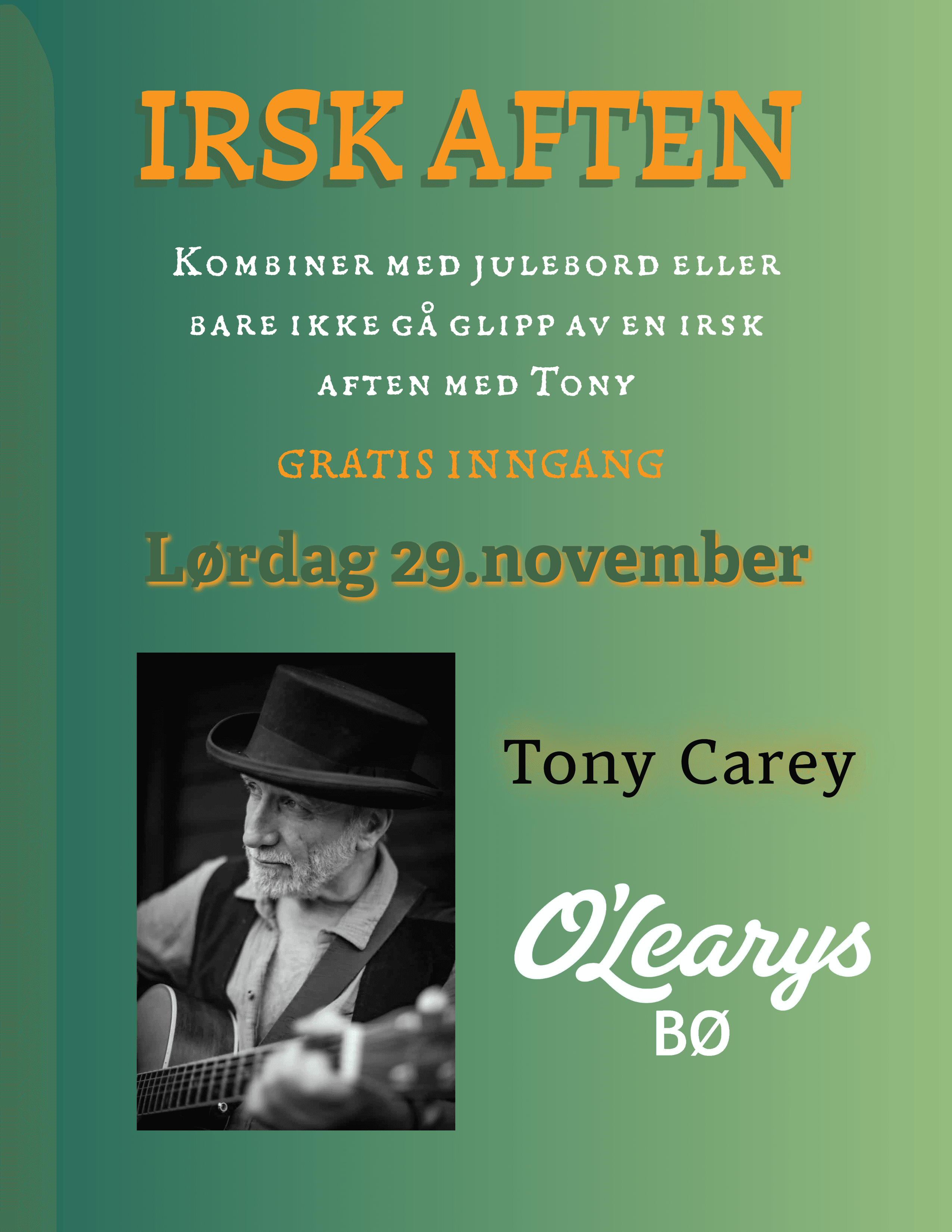 Tony Carey er en utvandret ire som har sunget et sortiment av irsk folkemusikk og andre kjente sanger rundt i verden i en årrekke.