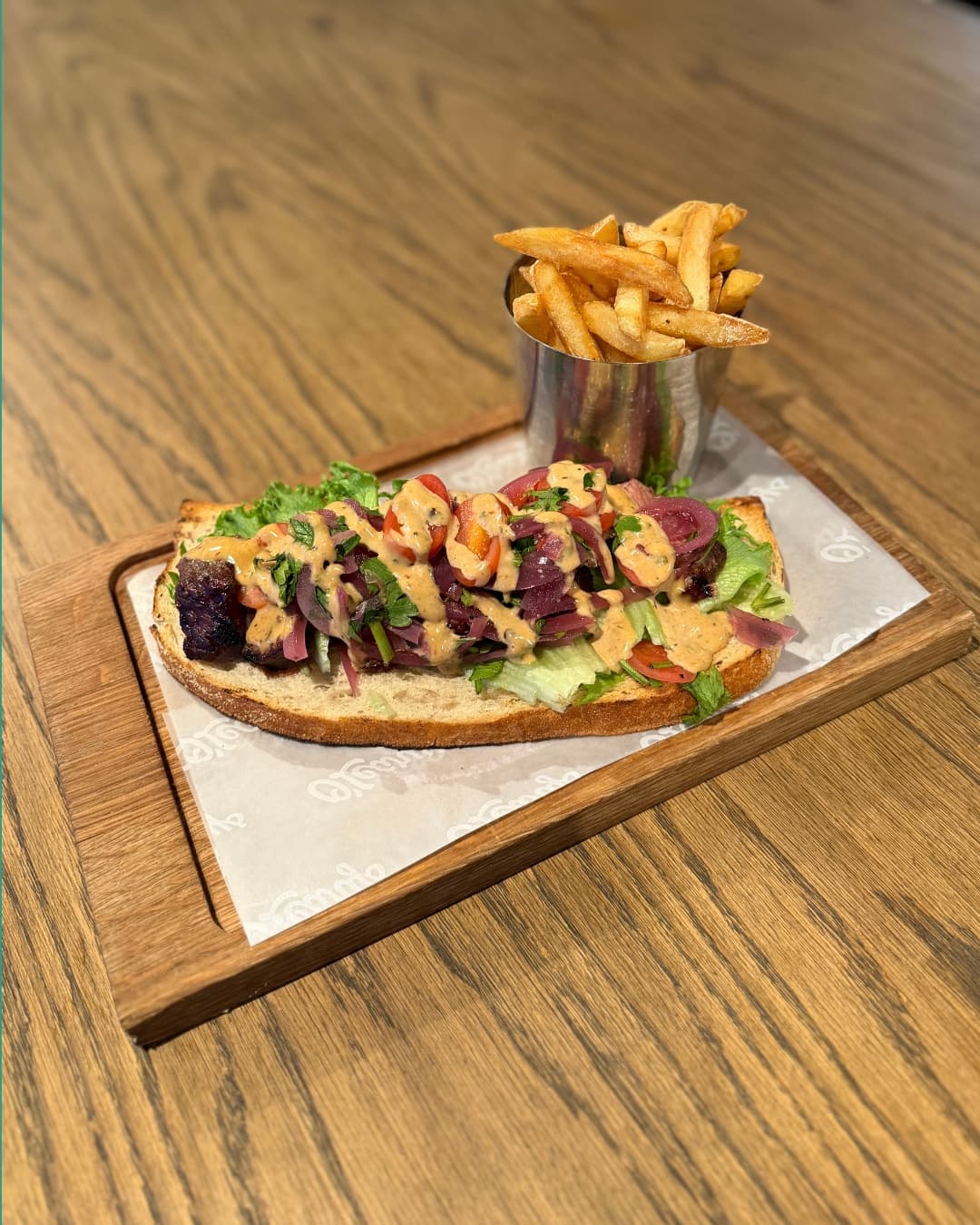 Grillet kyllingfilet i surdeigsbaguette med ranchdressing, guacamole, pico de gallo, parmesan og sprø salat. Serveres med ekstra ranch-dipp ved siden av.