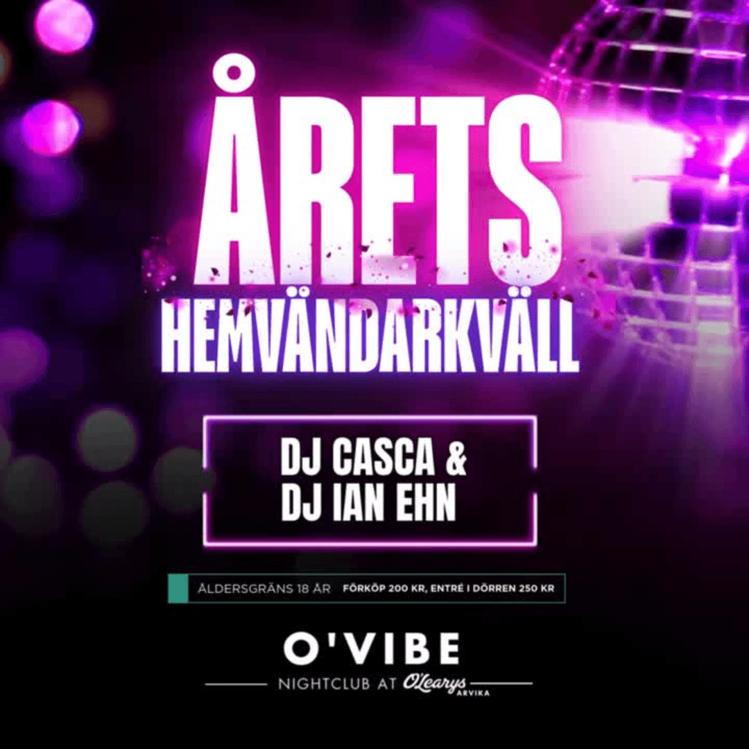 O’Vibe | Juldagen 2025! Årets stora hemvändarkväll – med DJ Casca & DJ Ian Ehn! Det är äntligen dags! Juldagen är tillbaka och vi öppnar upp hela huset för en av årets mest efterlängtade fester. Det här är kvällen då alla är hemma och alla är ute. Missa inte Årets Hemvändarkväll på O’Learys! Förköp 200 kr, entré i dörren 250 kr, åldersgräns: 18 år Varmt välkommen – vi ses på Juldagen! 🎅✨