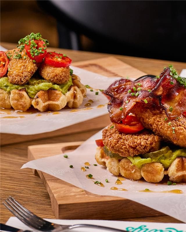 Krispigt friterad kyckling på belgisk våffla toppad med pickles, bacon, krämig guacamole, gräslök, picklad jalapeño, lime och hot honey.