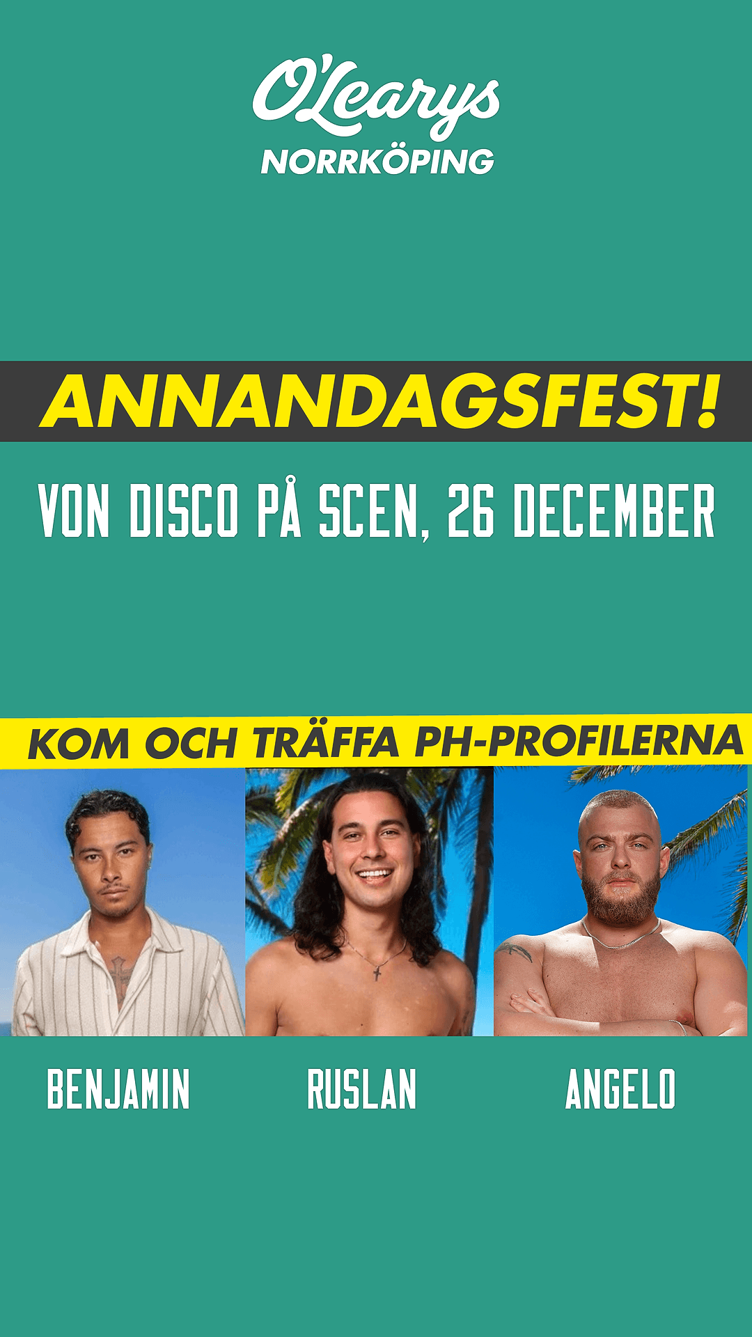 Den 26 december smäller det! Vi har Von Disco på scen som tillsammans med PH-deltagarna Ruslan, Angelo & Benjamin förvandlar natten till ett tropiskt kaos. Direkt från tv-rutan till scenen – redo att festa och hypea alla!