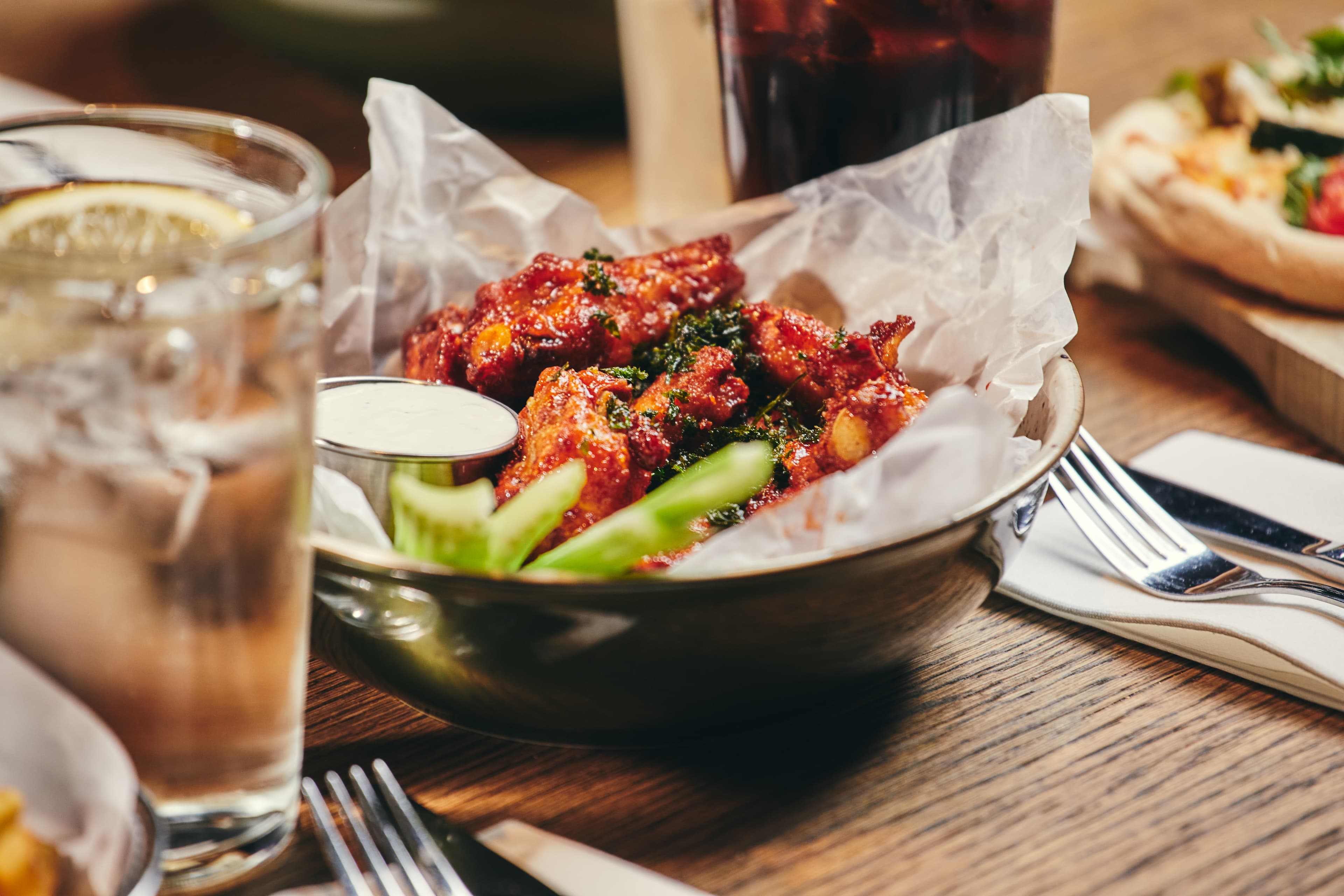 Friterade kycklingvingar slungade i en het chiliglaze. Serveras med selleristavar och en krämig blue cheese dip.
