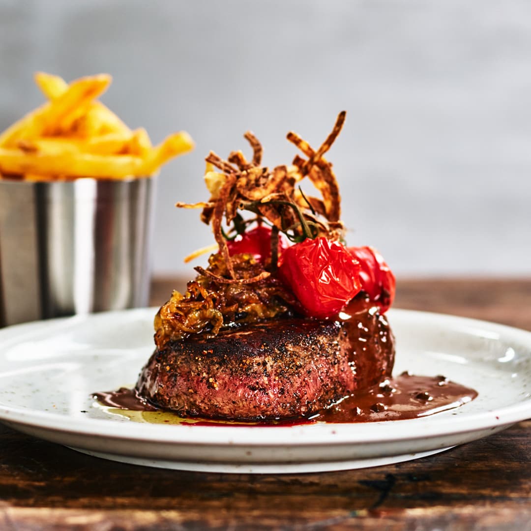 Klassisk pepparstek på oxfilé som toppas med friterad lök och persilja. Serveras med krämig pepparsås, ugnsbakade körsbärstomater och pommes frites.