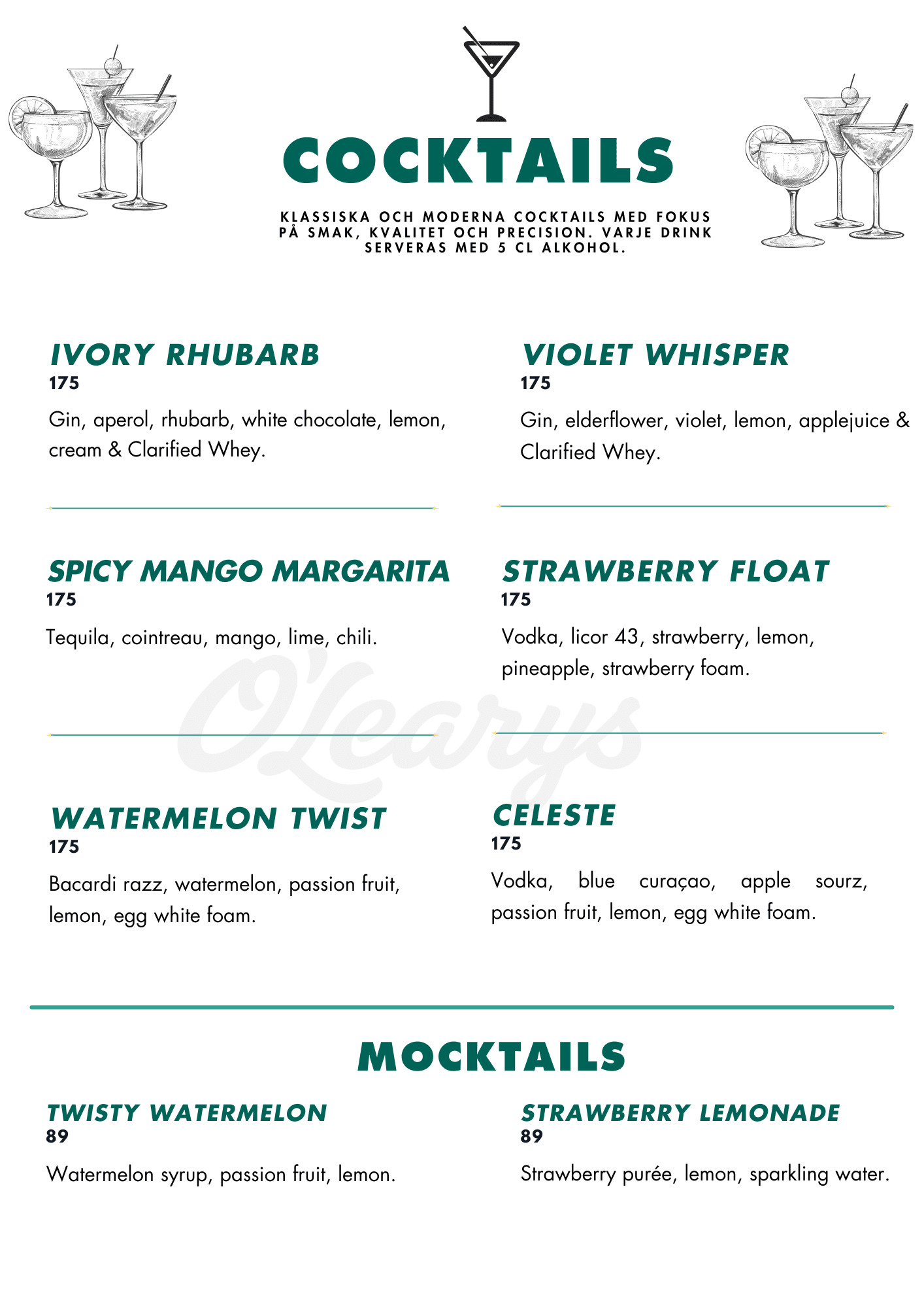 Välkommen till O’Learys Kistas cocktailbar – platsen där klassiska favoriter möter moderna smaker. Här blandar våra erfarna bartenders allt från tidlösa cocktails till kreativa signaturdrinkar, alltid med noggrant utvalda råvaror och en passion för detaljer. Oavsett om du vill starta kvällen med en elegant drink, fira med vänner eller koppla av efter jobbet erbjuder vår cocktailbar en avslappnad atmosfär, skön stämning och något i glaset för alla smaker. Självklart finns även alkoholfria alternativ av samma höga kvalitet.