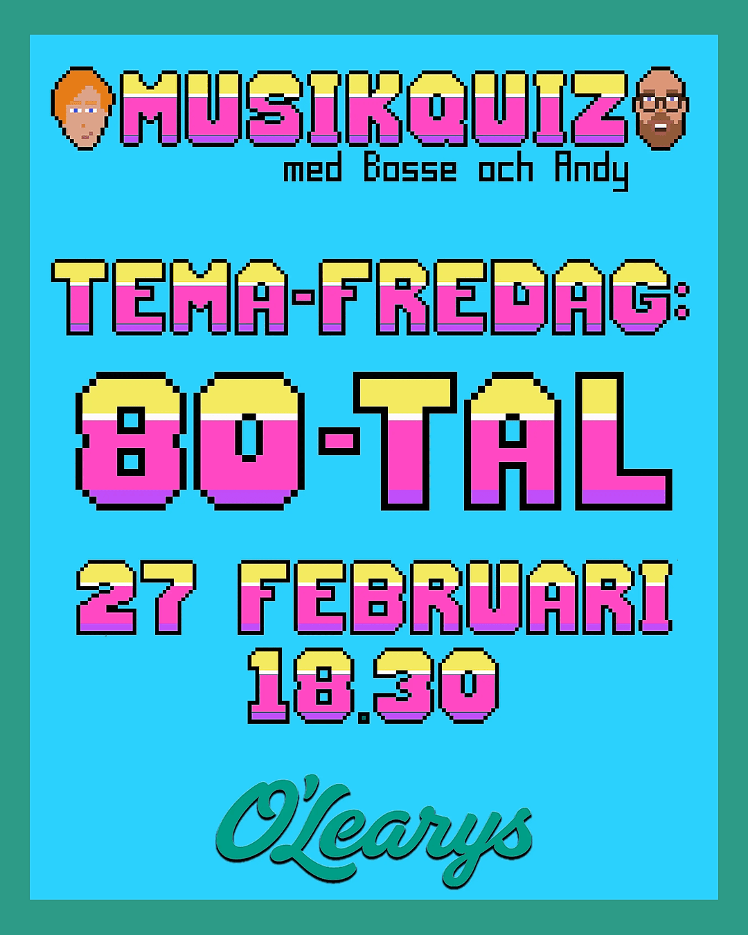 Välkommen på en kväll fylld av 80-talsvibes, klassiska hits och quizkul! 🎉 Ta med vänner, kollegor eller familjen och testa era musikminnen i vår underhållande quizkväll med tema: 80-tal tillsammans med Bosse & Andy.